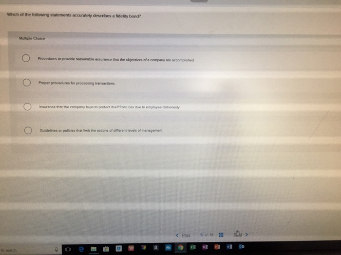 Proper procedures for processing transactions. Which of the following statements accurately describes a fidelity bond. Please find below the solution.